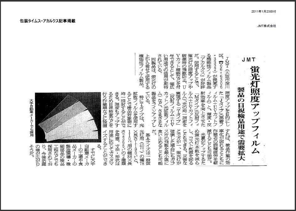 アカルクス包装タイムス取材所定の塗装工場などの検査用としてニッチ分野で使用されてきましたが最近のエコ推進が追い風で多く採用され始めました。いまでは10種以上のラインナップになり、より使いやすく改良革新させて頂いています。これからもアカルクスの新しい可能性に挑戦します。